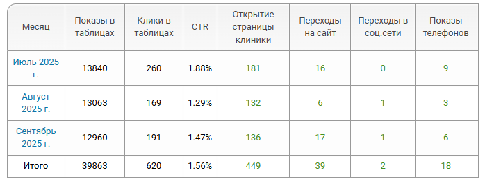 • Показы в таблицах — сколько раз компания была показана в списках на главной странице, по районам, метро и услугам.